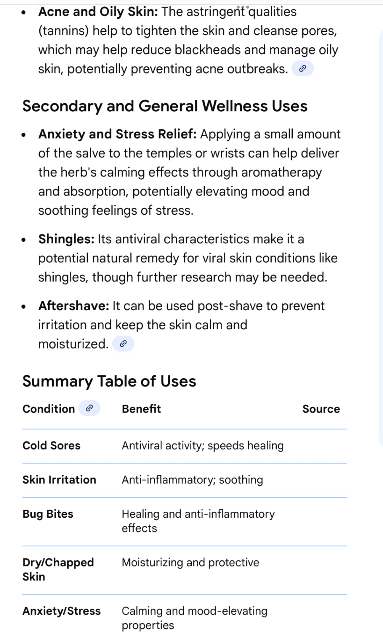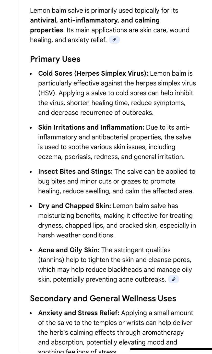Ingredients: Lemon Balm, olive oil, bees wax and vitamin e oil. 2.2 ounces