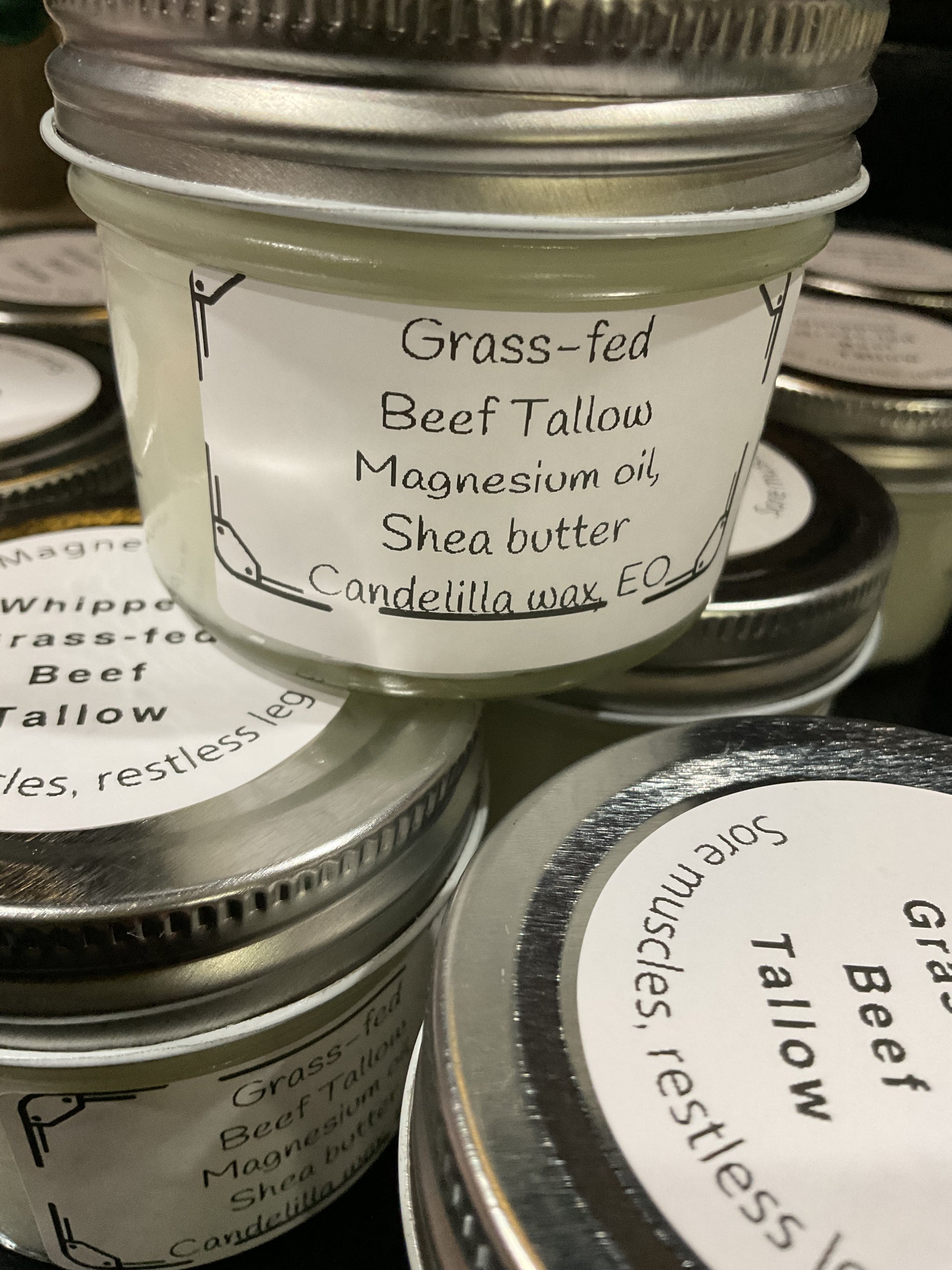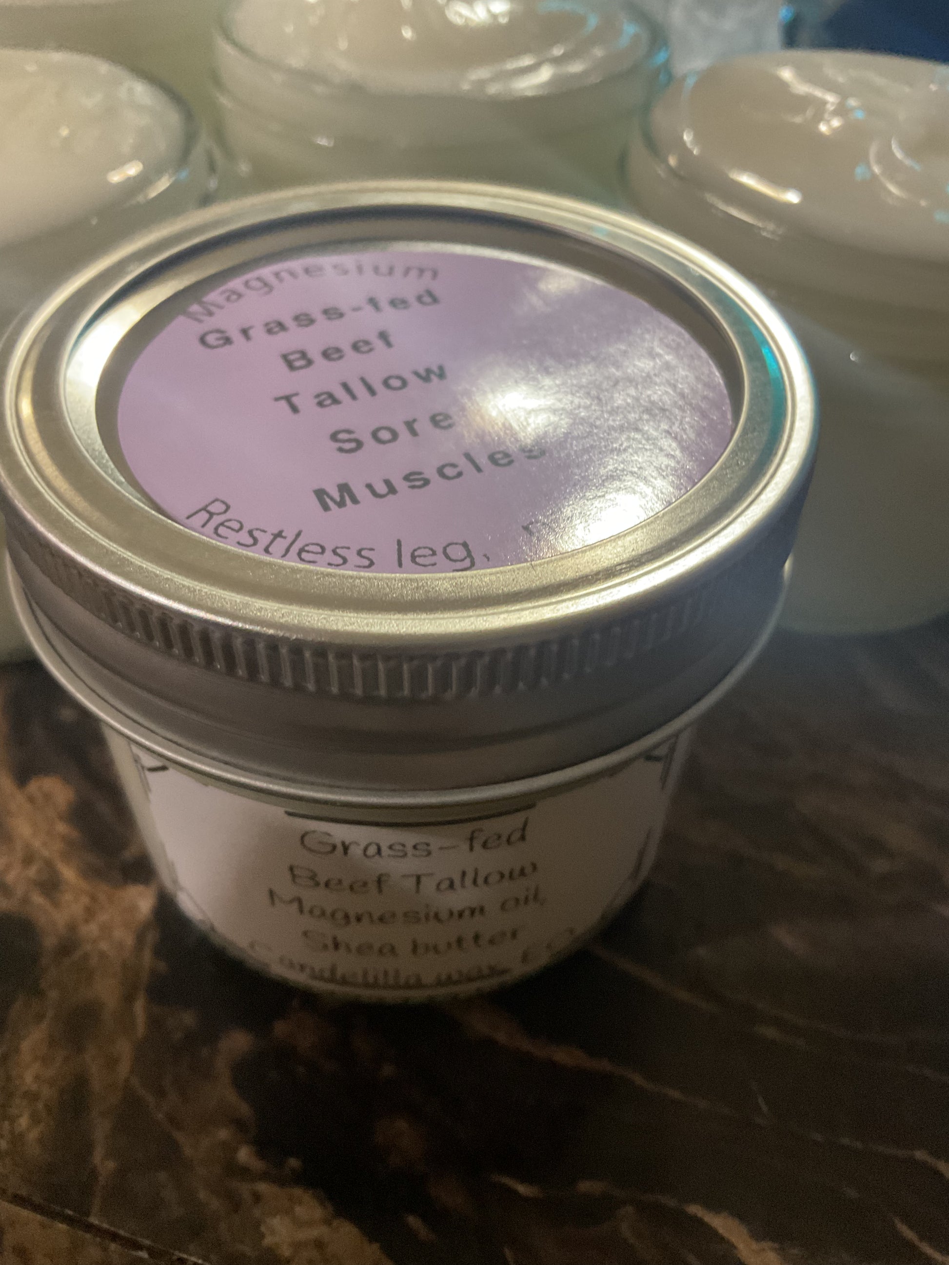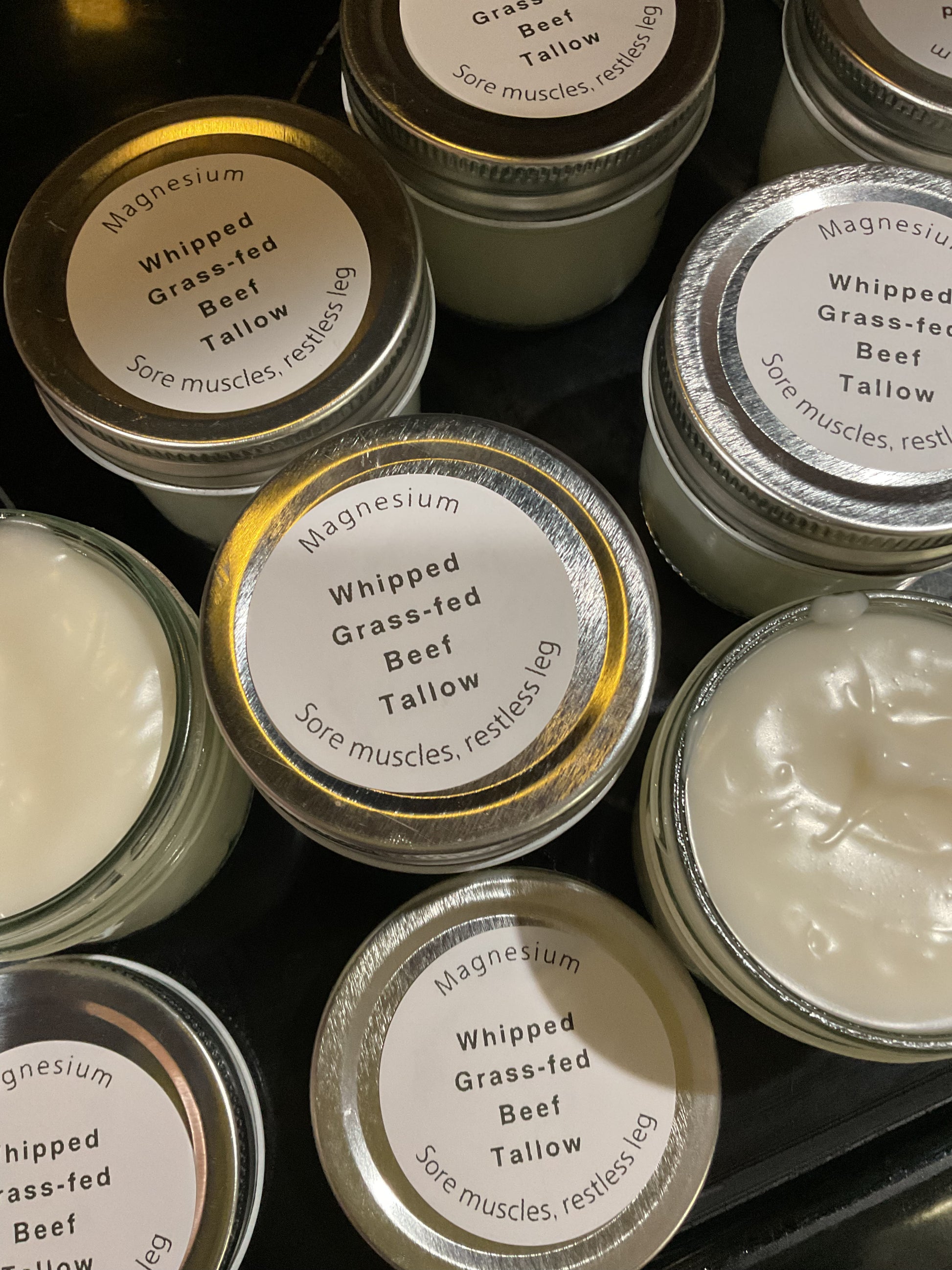 Organic grass-fed beef tallow naturally is rich in vitamins A, D, E and K, nourishing our skin. The added magnesium is for relief of tired sore muscles, restless leg, neuropathy. Absorbs well. 4 oz jar.